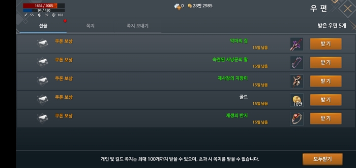 쿠폰 보상으로는 악마의 검 / 숙련된 사냥꾼의 활 / 제사장의 지팡이 / 10만골드 / 재생의 반지 이렇게 우편으로 도착합니다. 초반에 마법등급의 무기라도 있어야지 나름 사냥 속도가 나오더라구요. 그럼 카오스 모바일 열렙 득템하세요~!!!!