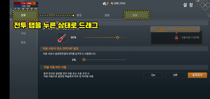 이것저것 누르다가 보니깐 잠깐 메뉴들이 보입니다. 바로 "전투" 부분을 꾹! 누른상태로 오른쪽으로 드래그하면 화면이 떨리면서 숨겨진 메뉴들이 보입니다. 해상도나 뭐 그런 문제로 조작/환경/알림/정보 부분의 탭 메뉴들이 출력되지 않았나봅니다.
