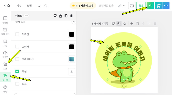 네이버 프로필 이미지 크기의 화면에 만들어지면 "요소"에서 무료 일러스트를 고르거나 아니면 자신이 가지고 있던 사진을 추가해서 프로필 이미지를 만들면 됩니다. 저는 "요소"에서 미리캔버스의 악어 캐릭터를 추가하고 "텍스트"에서 "곡선" 기능을 넣어서 간단한 문구만 넣어봤습니다.