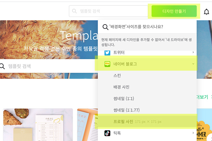 미리캔버스에 로그인 한 뒤에 "디자인 만들기" 에서 직접 웹용 해상도 161px, 161px를 입력하거나 "네이버 블로그"탭에서 "프로필 사진"을 선택해서 디자인을 해도 괜찮습니다. (미리캔버스 설정값은 프로필 사진이 171px군요. 정사각형이면 별 상관 없습니다.)