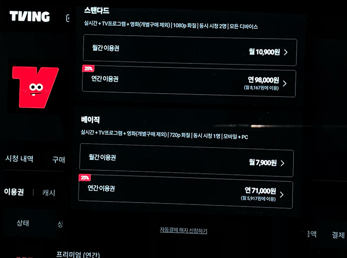 저는 앞에 소개했던 내용처럼 티빙 1년짜리 연간이용권을 결제하고 이용 중입니다. 보통은 월마다 이용권을 결제하고 사용하는 방식인데 "연간이용권"은 1년짜리 구매라 나름 저렴합니다. (기본 25% 정도 세일 기간에 40%까지)