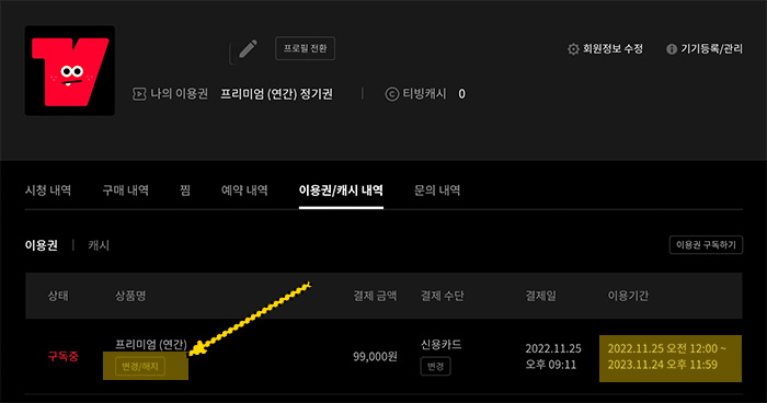2. 티빙의 MY 페이지이서 "이용권/캐시 내역"을 선택하고 이제 자신의 이용권에서 상품명을 보면 "프리미엄 (연간) - 변경/해지" 글씨가 보입니다. 변경/해지 버튼을 눌러서 해지를 진행하면됩니다.