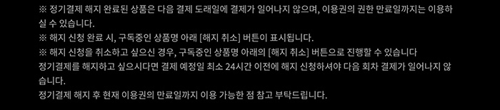 - 정기결제 해지 완료된 상품은 다음 결제일에 결제 진행 X