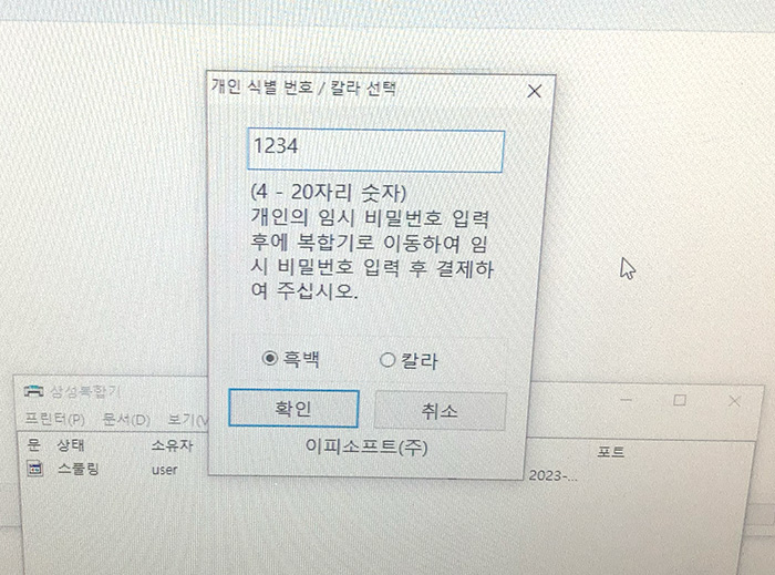 PC에서 개인 식별 번호를 입력하고 프린트물의 컬러를 선택합니다. 저는 흑백으로 필요한 부분이라 "흑백"을 선택했고 컬러 인쇄를 원하는 경우 "컬러"에 체크하면됩니다. 확인을 눌러 다음으로 진행합니다.