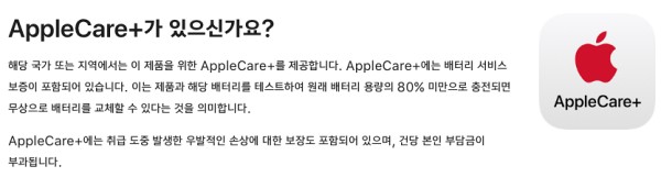 애플케어플러스 보증에 가입된 상태라면 배터리 용량의 80% 미만으로 충전되면 무상으로 배터리 교체가 가능합니다. 애케플 보증 기간 내에는 배터리로 교체로 스트레스 받을 필요가 없다는 말이죠.