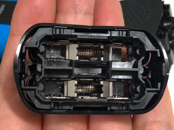 커버를 열면 3개의 커팅요소가 있는 면도기 헤드가 보입니다. 가장자리 2개의 면도망은 좌우로 움직여서 피부에 더 가깝게 밀착합니다. 고급 기종의 경우는 360도 돌아가는 방식이라 이렇게 고정된 상태에서 좌우로 움직이는 날보다 더 디테일한 면도가 가능하겠죠.