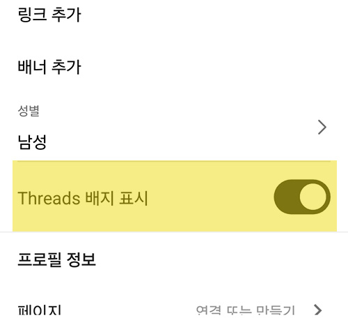 그리고 인스타 프로필 편집 화면의 하단에 위치한 "Threads 배지 표시" 항목을 터치하여 비활성화 시킵니다. 만약 다시 스레드 배지를 노출하고 싶다면 슬라이드를 옆으로 밀어서 활성화를 하면 끝입니다.